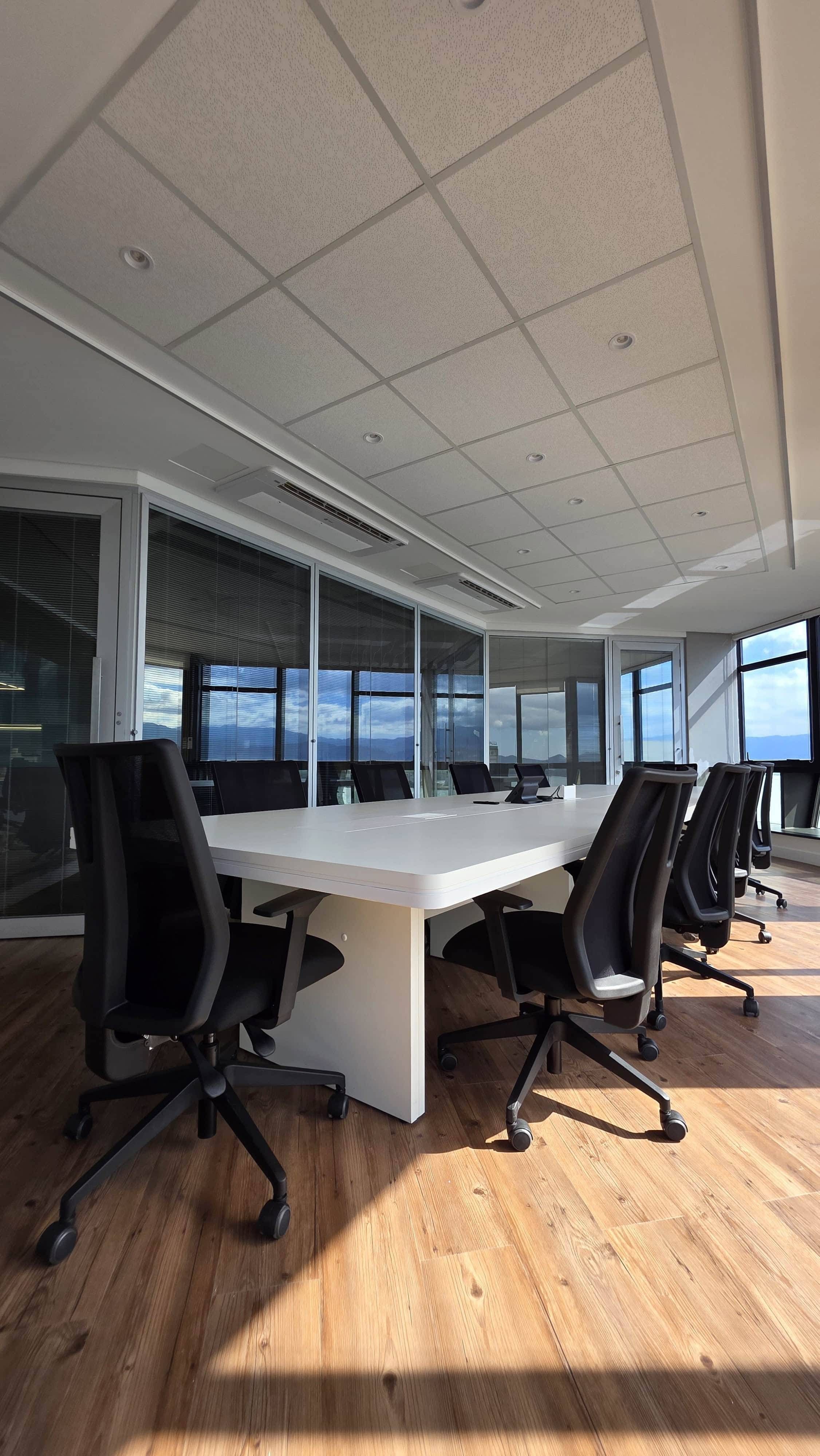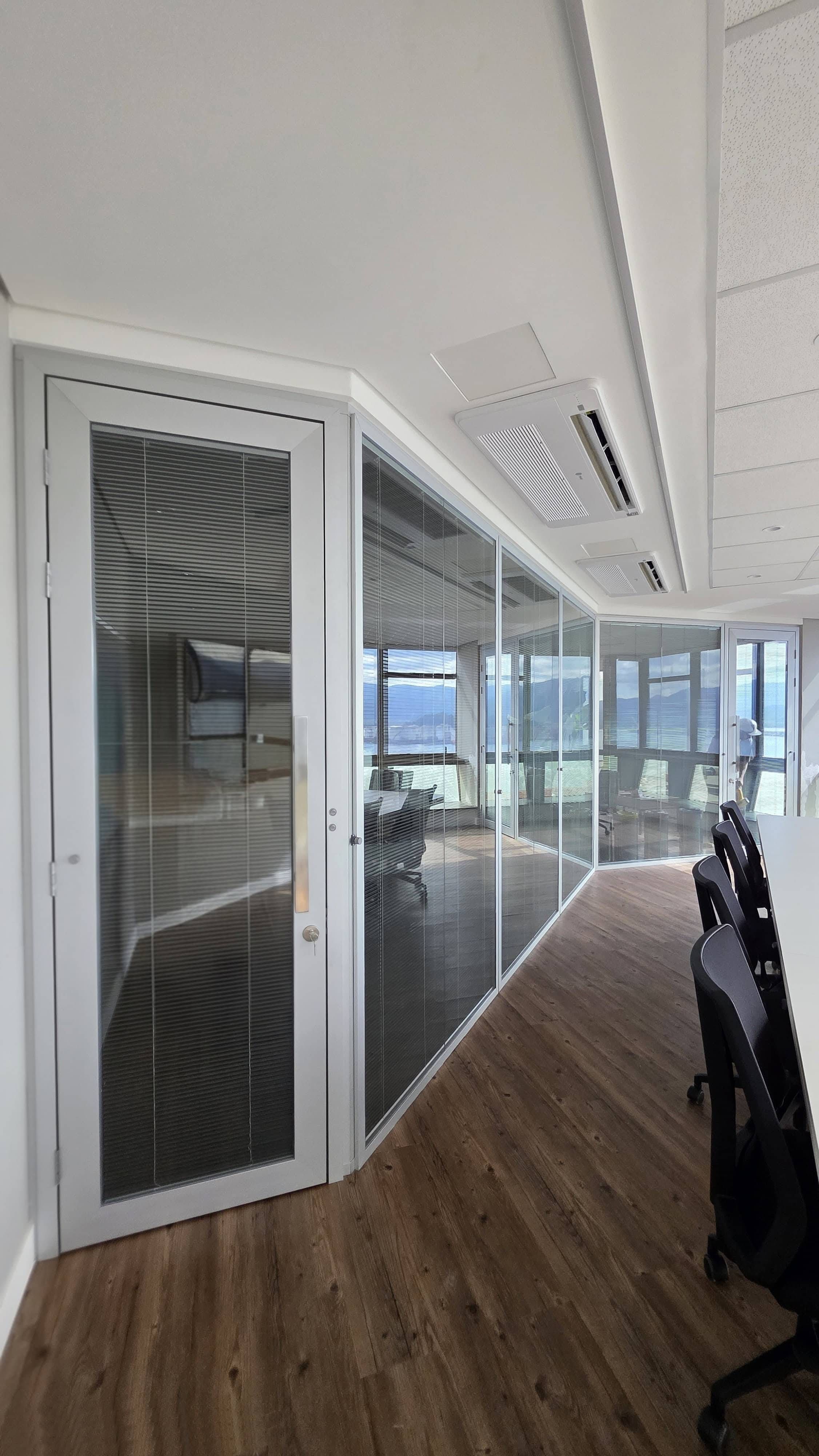 As divisórias piso-teto tiveram papel fundamental no projeto, permitindo a setorização dos ambientes sem comprometer a circulação e a eficiência operacional. Essa solução proporciona maior privacidade, melhor organização dos fluxos internos e flexibilidade para futuras adaptações do layout.
